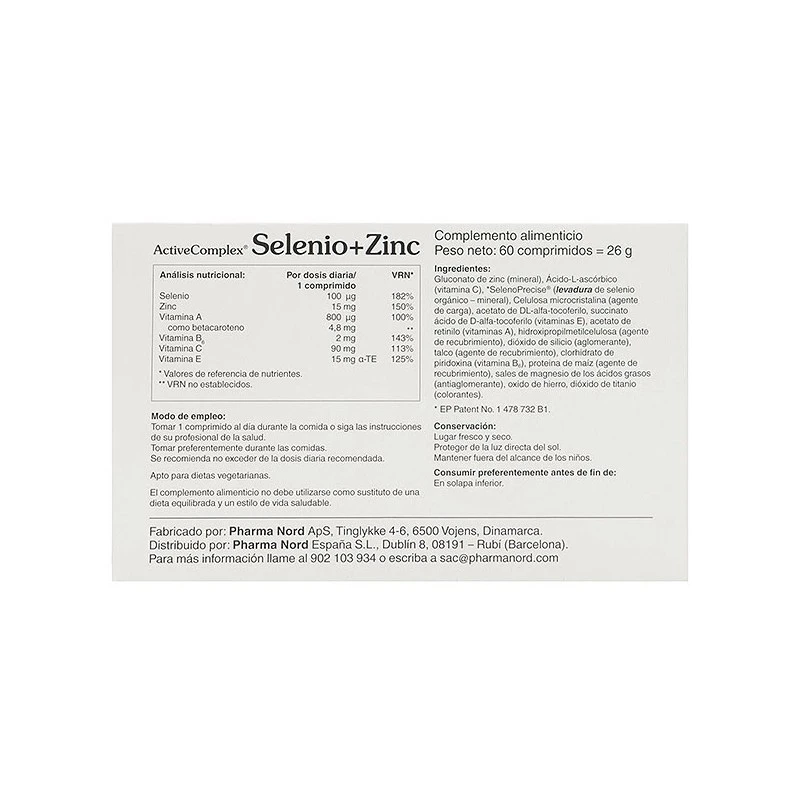 ActiveComplex Selenio+Zinc es el complejo antioxidante ideal, ya que no sólo contiene selenio orgánico puro y zinc, si no también las vitaminas A, C, E y B6, todas ellas con propiedades que contribuyen a proteger el ADN, las proteínas y los lípidos contra las lesiones oxidativas.-Contribuye al funcionamiento normal del sistema inmunológico.-Contribuye a la protección de las células corporales ante en estrés oxidativo.-Apoya el equilibrio ácido-base normal.-Ayuda a mantener la visión normal.-25 años de investigación.-Producido bajo control farmacéutico danés.