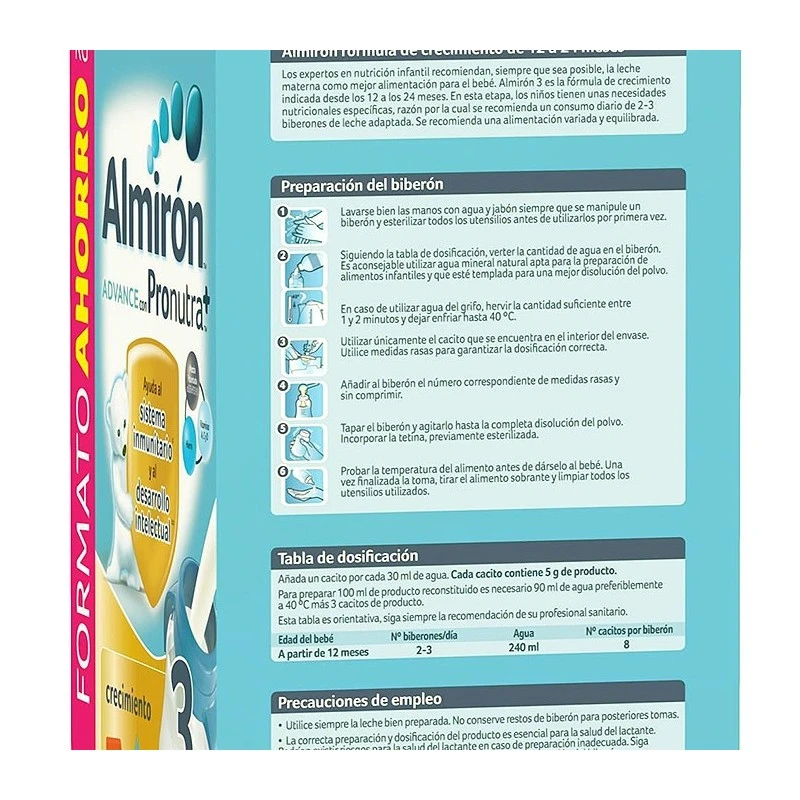 A partir de 12 meses y según el criterio del pediatra se recomienda introducir Almirón Advance 3 Crecimiento. Los expertos en nutrición recomiendan utilizar leche infantil adaptada hasta los 36 meses y asegurar una ingesta diaria de al menos 500 ml para favorecer el desarrollo de una flora intestinal saludable, así como el aporte equilibrado de nutrientes dentro de una dieta diversificada.