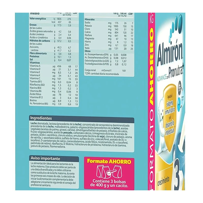Almirón Advance 3 1200 g ayuda al sistema inmunitario y al desarrollo cerebral. Contiene Pronutra+, una combinación de Prebióticos patentados scGOS/lcFOS (9:1), Hierro y Vitaminas A, C y D.