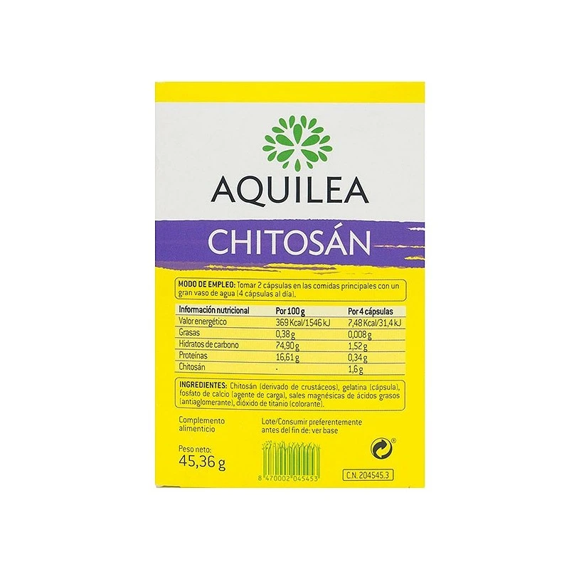 Aquilea Chitosán es una fibra marina extraída de la chitina, un componente del caparazón de los crustáceos. Parte de las grasas de la dieta son recogidas por la chitina y de esta forma el cuerpo no las puede absorber y son eliminadas directamente por el organismo, ayudando a disminuir el aporte calórico precedente de las grasas de la dieta.