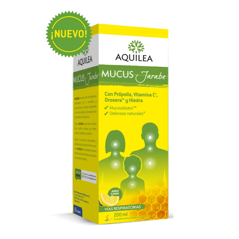 Aquilea Mucus es un complemento alimentico líquido para toda la familia que contiene N-Acetilcisteína, Metilsulfonilmetano (MSM), Própolis, Drosera, Hiedra y Vitamina C. La Vitamina C contribuye al funcionamiento normal del sistema inmunitario y la drosera es una planta que contribuye a mantener el nivel óptimo de muscosidades y a la salud de las vías respiratorias.