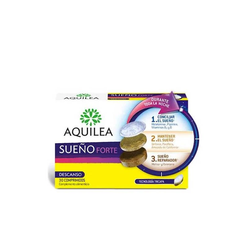 Aquilea Sueño Forte 30 comprimidos contribuye a conciliar el suelo con la primera capa, que se libera rápidamente. Con melatonina para ayudar a disminuir el tiempo necesario en conciliar el suelo, acompañado de piperina, vitamina D y vitamina B6, para una acción sinérgica.
