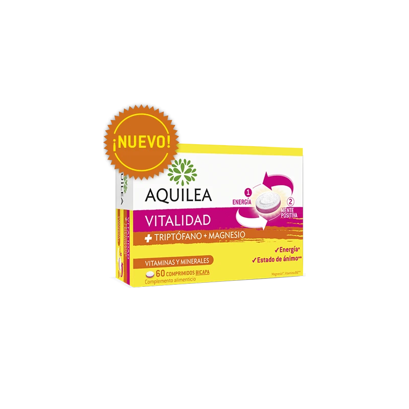 Aquilea Vitalidad es un complemento bicapa a base de triptófano, aminoácido esencial que el organismo utiliza para producir serotonina, un neurotransmisor regulador del estado de ánimo
