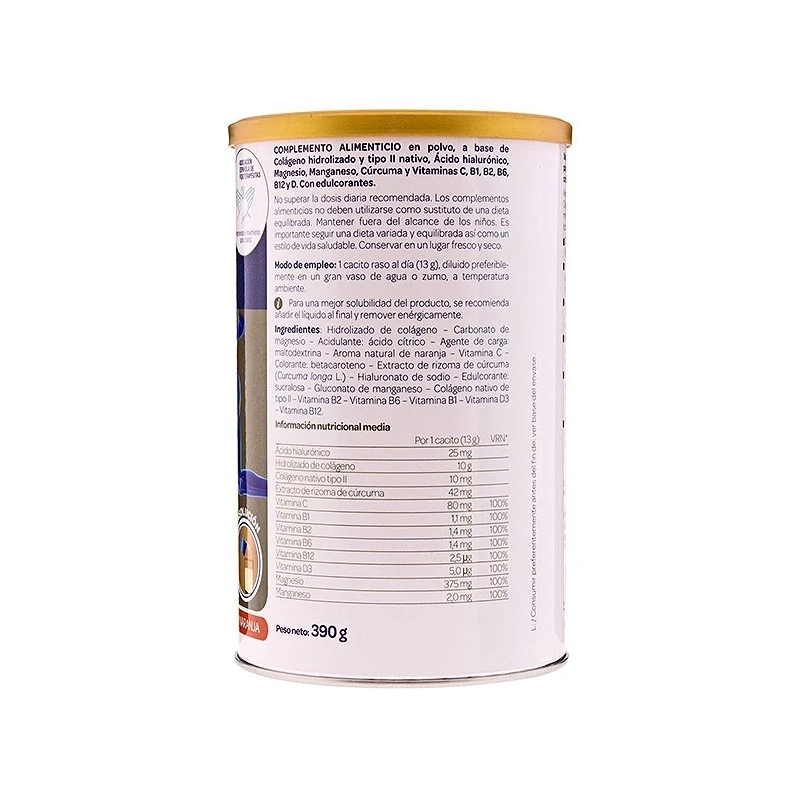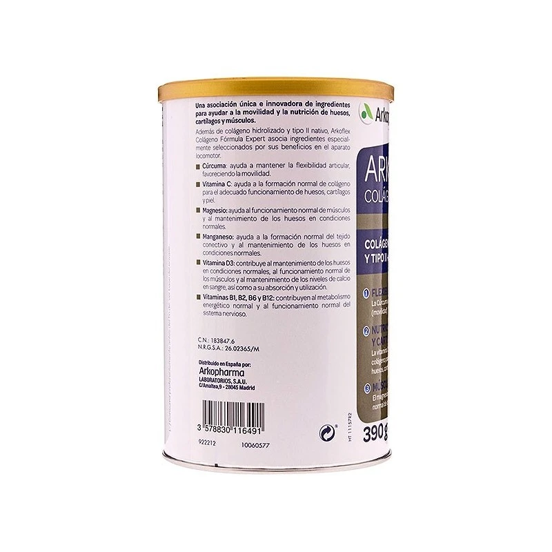 Arkoflex Colágeno Fórmula Expert ofrece una asociación única e innovadora de ingredientes para ayudar a la movilidad y la nutrición de los huesos, cartílagos y músculos. Además de colágeno hidrolizado y tipo II nativo, Arkoflex Colágeno Fórmula Expert asocia ingredientes especialmente seleccionados por sus beneficios en el aparato locomotor.-Cúrcuma que ayuda a mantener la flexibilidad articular, favoreciendo la movilidad. -Vitamina C que ayuda a la formación normal de colágeno para el adecuado funcionamiento de huesos, catílagos y piel.-Magnesio que ayuda al funcionamiento normal de los músculos y al mantenimiento de los huesos en condiciones normales. -Manganeso que ayuda a la formación normal del tejido conectivo y al mantenimiento de los huesos en condiciones normales.-Vitamina D3 que contribuye al mantenimiento de los huesos en condiciones normales, al funcionamiento normal de los músculos y al mantenimiento de los niveles de calcio en sangre, así como a su absorción y utilización.-Vitaminas B1, B2, B6 y B12 que contribuyen al metabolismo energético normal y al funcionamiento normal del sistema nervioso. Vitamina C, que contribuye a la formación normal de colágeno para el adecuado funcionamiento de los huesos, de los cartílagos y de la piel. El magnesio contribuye al mantenimiento normal de los huesos.