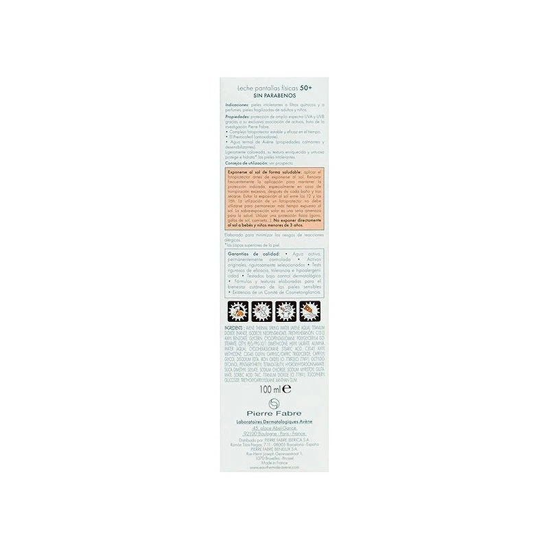 Avene Leche 50+ 100ml es una leche protectora de muy alta protección de las pieles intolerantes o fragilizadas. Eficaz contra el conjunto de la radiación solar (UVB-UVA largos y cortos).