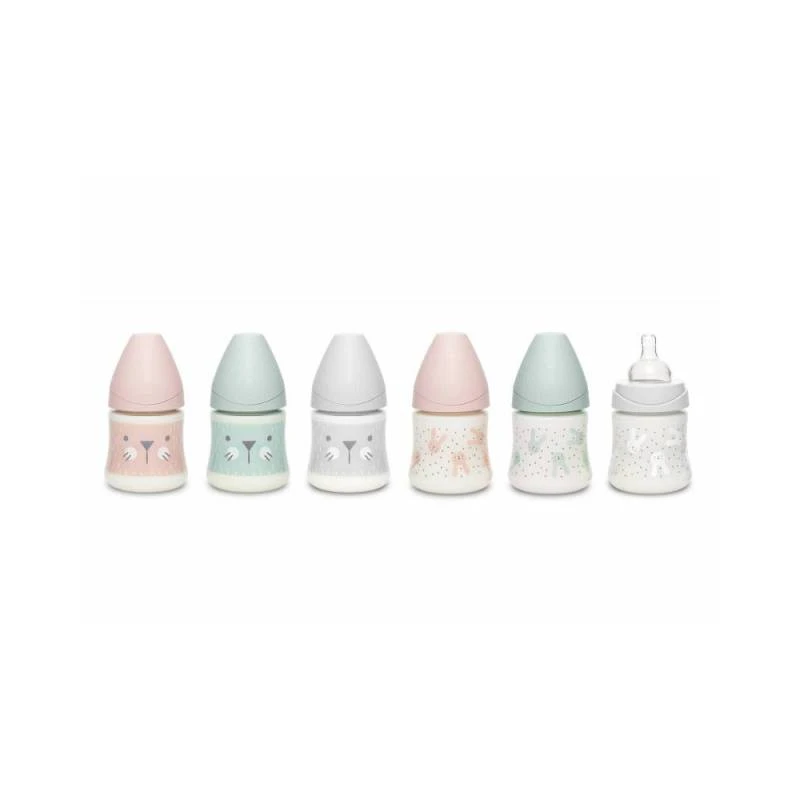 BIberón de boca ancha que incorporan una tetina de silicona de talla única con tetina redonda y de tres posiciones, con el sistema anticólico patentado por Suavinex.
