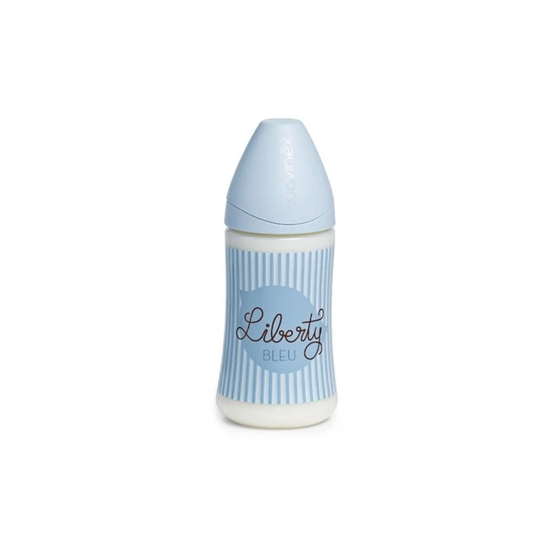 El biberón de 270ml lleva una tetina 3 posiciones de látex, mientras que el chupete Evolution incorpora en su parte interior un canal de circulación que posibilita la circulación de aire y la expulsión de saliva