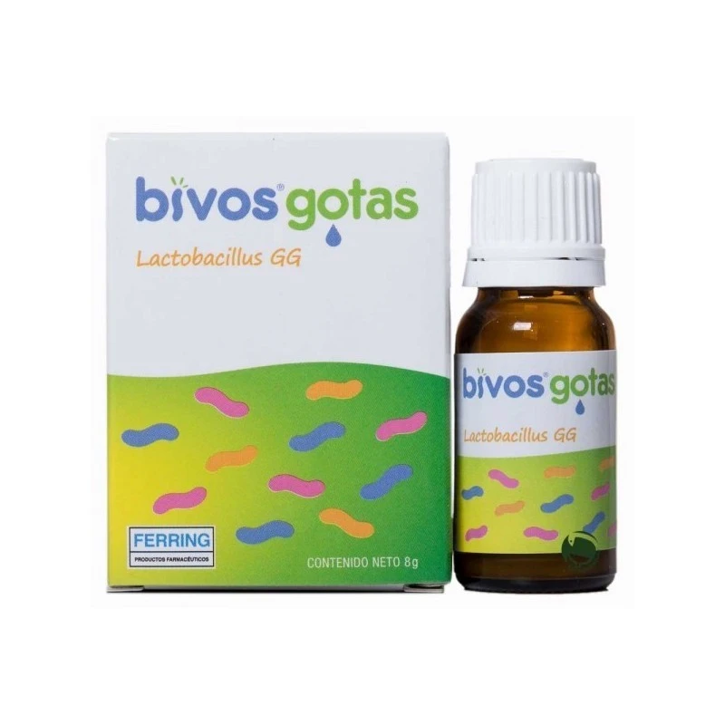 Bivos Gotas Lactobacillus GG 8ml, es un complemento alimenticio de lactobacilus GG. Frasco de 8ml. Reestablece la flora intestinal, y ayuda a tratar la diarrea aguda, los gases y el estreñimiento, especialmente en lactantes y niños.