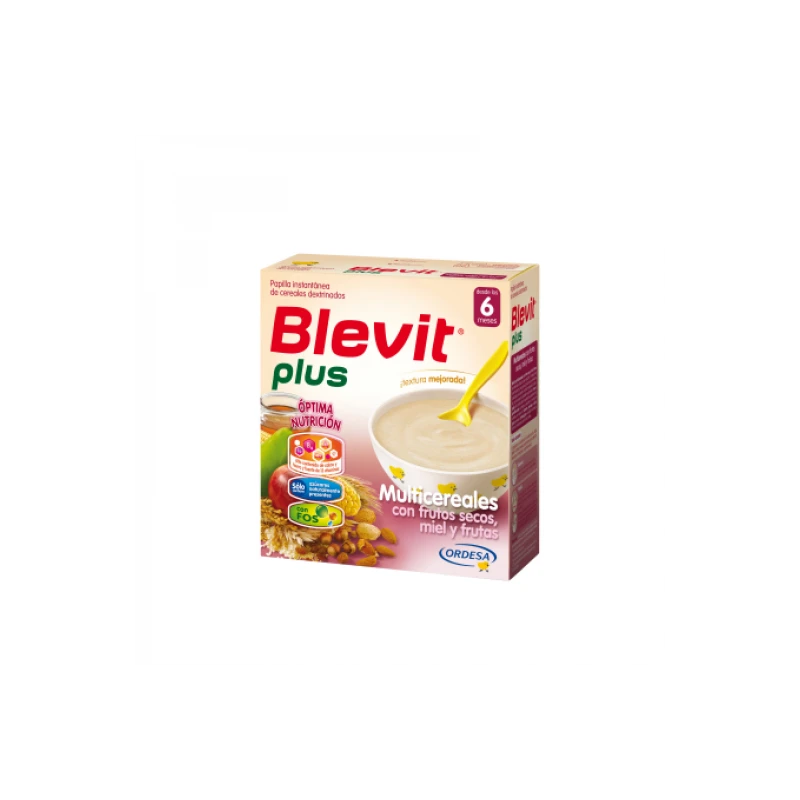 La papilla Blevit plus Multicereales con frutos secos, miel y frutas está elaborada a base de una mezcla equilibrada de 7 cereales, miel, frutas (manzanas, peras y pasas) y frutos secos (almendras y avellanas) que le aportan un alto valor energético y nutricional, y que hacen que sea la papilla más completa, la superpapilla. Esta combinación de ingredientes le proporciona un agradable sabor y contribuye a aumentar su contenido en nutrientes.Además de nutrir, Blevit plus Multicereales con frutos secos, miel y frutas te ofrece mucho más. Se elabora mediante un exclusivo sistema de dextrinación enzimática que adapta la composición de los cereales al grado de maduración digestiva del bebé, favoreciendo que absorba mejor sus nutrientes y consiguiendo así una Óptima Nutrición.Con fructooligosacáridos (FOS), que favorecen el crecimiento de una flora intestinal saludable, rica en bifidobacterias y lactobacilos, por lo que se considera que están relacionados con el desarrollo del tracto digestivo, y las defensas naturales del bebé.Blevit plus Multicereales con frutos secos, miel y frutas presenta un alto contenido en calcio y hierro, y es fuente de 13 vitaminas, para ayudar a cubrir las necesidades del bebé de estos micronutrientes esenciales.Blevit plus Multicereales con frutos secos, miel y frutas no contiene azúcares añadidos, manteniendo el aroma y sabor natural de sus cereales, por lo que es una alternativa completa y equilibrada para que el bebé adquiera unos buenos hábitos de alimentación. Contiene azúcares presentes de forma natural en la miel, que le aporta a las papillas más nutrientes y un agradable aroma y sabor.Blevit plus Multicereales, frutos secos, miel y frutas se prepara de forma instantánea, proporcionando una papilla de textura suave, homogénea y de agradable sabor.Recuerda que las papillas de cereales son un alimento nutritivo, equilibrado y completo que forma parte importante de la alimentación del bebé desde sus primeros meses de vida. Por su alto contenido en hidratos de Carbono, resultan una fuente de energía ideal.