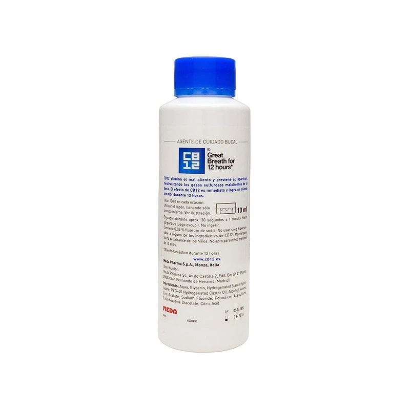 CB12® enjuague bucal es un enjuague específicamente formulado para el control y la eliminación de las sustancias que causan el mal aliento. Gracias a su uso, mantendrás las bacterias a raya durante hasta 12 horas, evitando el mal olor en la cavidad bucal.