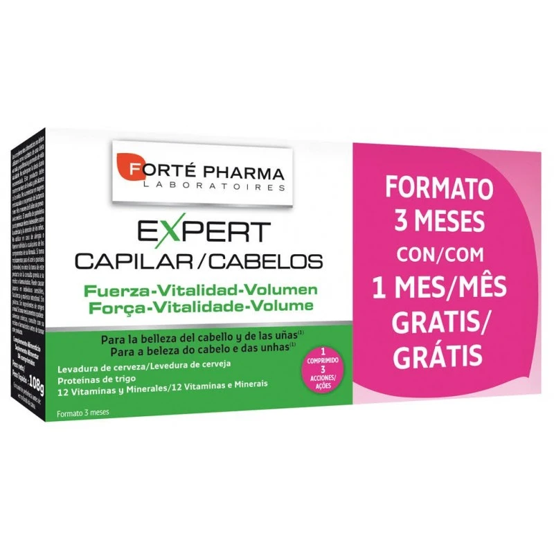 Expert Capilar Forte Pharma Formato 3meses es un complemento alimenticio que le aportará fuerza, vitalidad y volumen a tu cabello. Gracias a su combinación de activos fortalecedores. Mejor apariencia desde el primer uso.