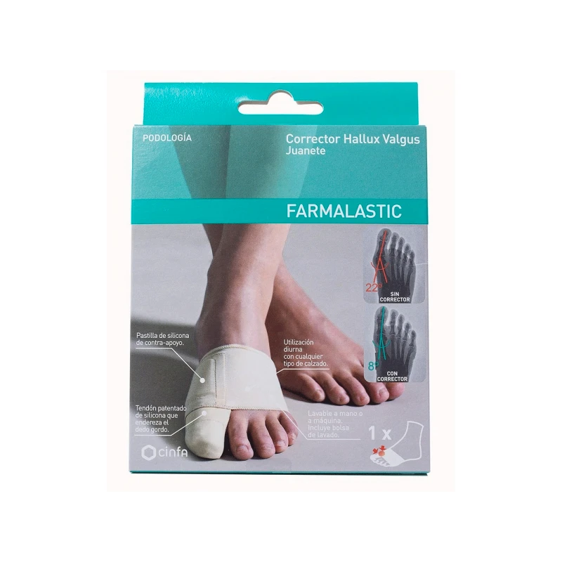 Farmalastic Corrector Juanetes está indicado para corregir y limitar la evolución del juanete. Relajar los dolores articulares. Talla mediana es para un contorno de 21,5 a 23cm.