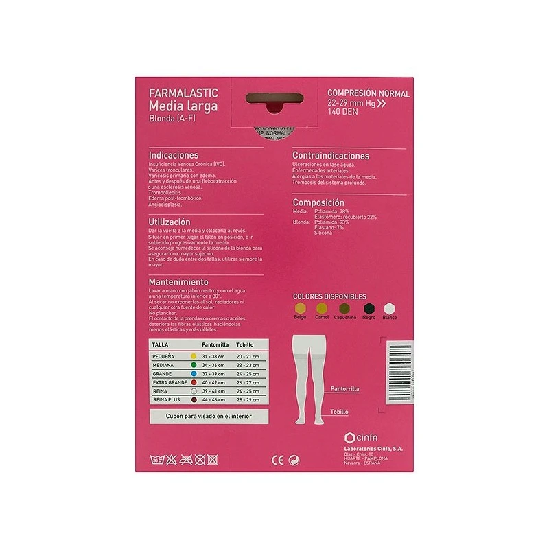 Farmalastic ha creado Farmalastic media pequeña blonda (A-F) compresión normal. Indicado especialmente para personas en tratamiento de patologías venosas y embarazadas con tendencia al edema.