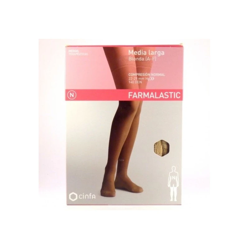 Farmalastic Media Larga Normal Beige Talla Reina es una media de compresión que proporciona seguridad y firmeza.