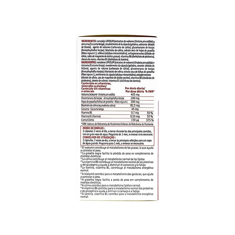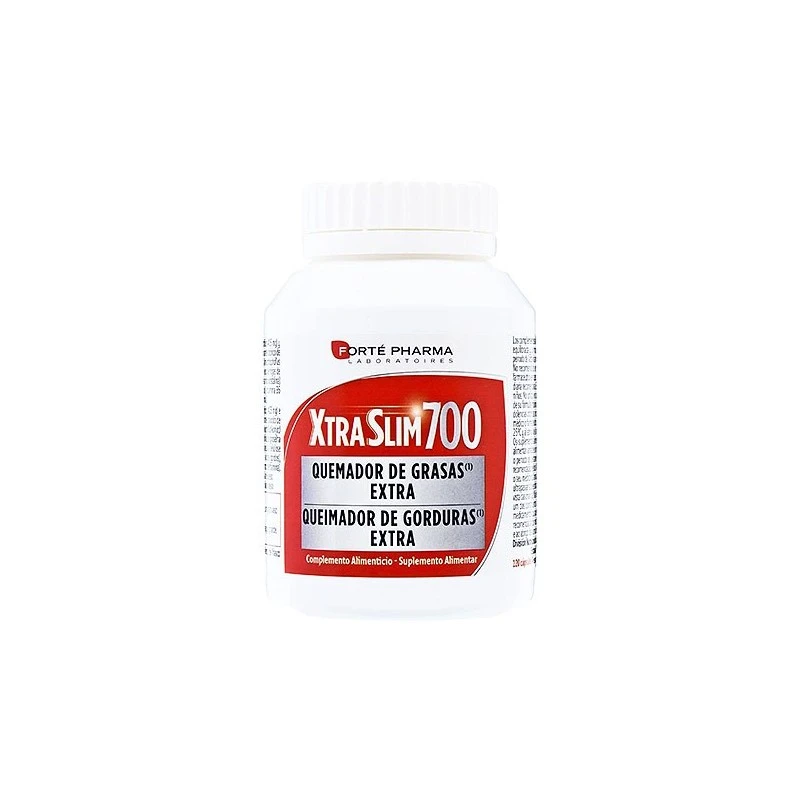 Complemento alimenticio específicamente formulado con 8 activos naturales que actúan conjuntamente para quemar la grasa del organismo. Esta fórmulada está basada en varios complejos: El Liposlim, una asociación de Cúrcurma y de Wakame que contribuye al metabolismo de las grasas facilitando combustión y también aumentando el gasto calórico, lo que ayuda a controlar el peso. También contiene Glucomanano de konjac que es una fibra natural y la Grosella negra que contribuyen a controlar el apetito y a drenar líquidos del organismo, lo que también favorece la pérdida de peso. Además, la fórmula se complementa con otros activos que actúan sobre el metabolismo de los lípidos, de los glúcidos y de las proteínas como la Colina ,nutriente esencial que actúa sobre el metabolismo de los lípidos,el Cromo ,que contribuye a mantener niveles normales de glucosa en sangre y las vitamina B1 y B6 que contriuyen a disminuir el canancio y la fatiga del organismo. Gracias a todos estos compuestos XtraSlim 700 Forte ejerce una triple acción completa como quemador de grasa,regulando el apetito y drenando el organismo para obtener una mejor resultado metabólico.