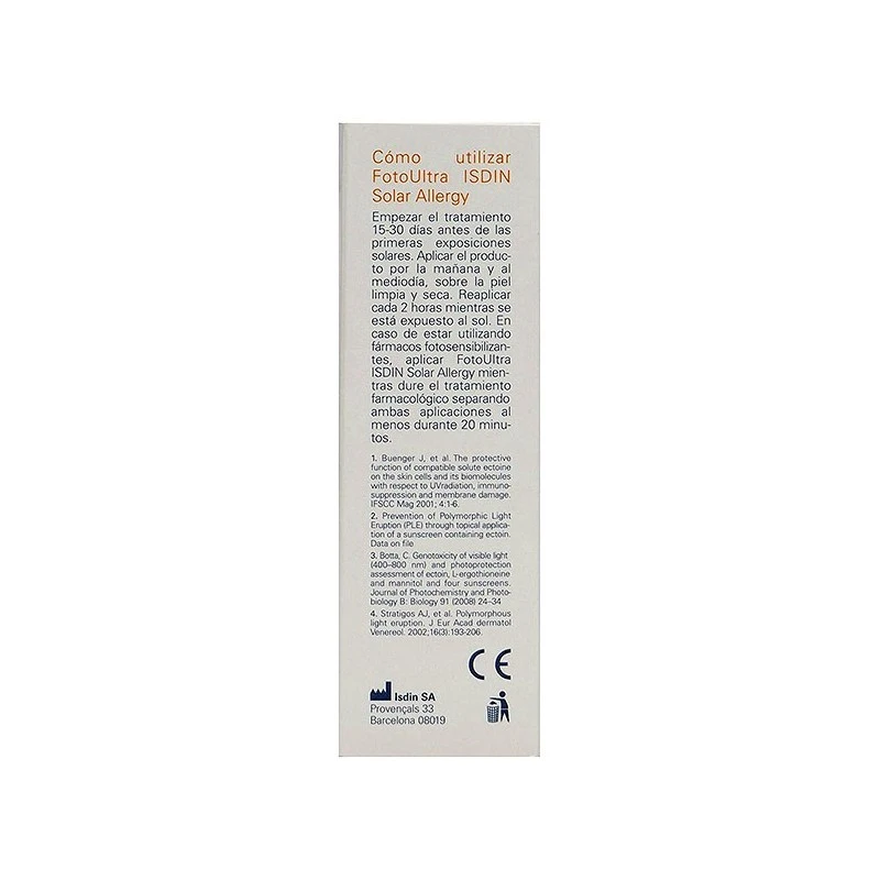 FotoUltra ISDIN Solar Allergy está hecho para la prevención y el alivio de los síntomas producidos por alergias solares y otros tipos de fotodermatosis. Además, ofrece una protección RUV dos veces más fuerte que una protección SPF 50+, debido a sus filtros RUVA y RUVB. Fotoprotector especialmente indicado para pieles reactivas al sol.