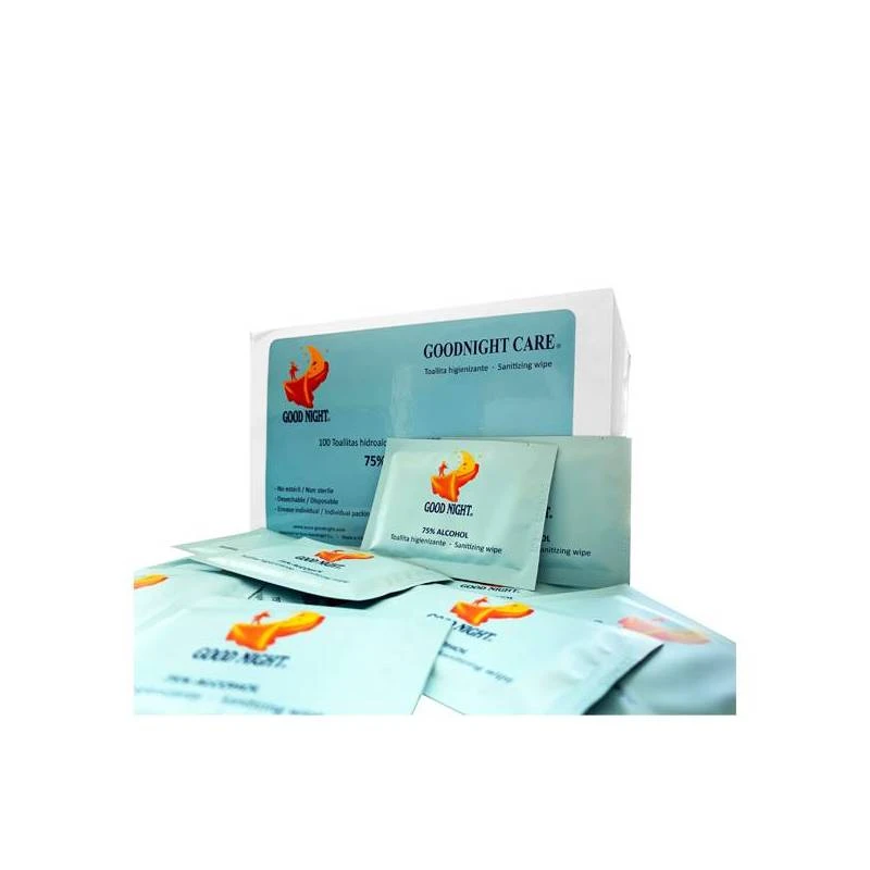 Caja de 100 toallitas individuales higienizantes de manos con 75% de alcohol.