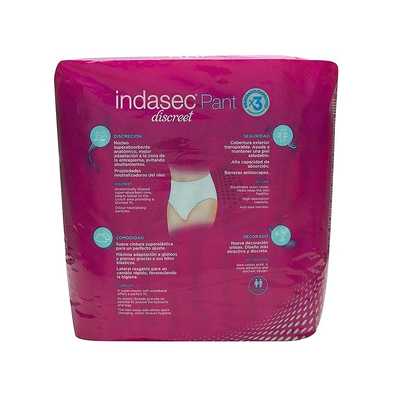 Indasec Discreet Pant con tecnología Invisible System se adapta mejor en la zona de la entrepierna, evitando incómodos abultamientos. Indasec® Discreet Pant es más estrecho. Con Indasec Pant podrás disfrutar los momentos más especiales sin ninguna preocupación, gracias a que garantiza la mayor absorción y discreción además de control del olor.Indasec Discreet Pant también incorpora:Barreras transversales para evitar escapes por la espalda.Indicador de nivel de saturación.Hilos elásticos curvos para un mejor ajuste a ingles y glúteos.