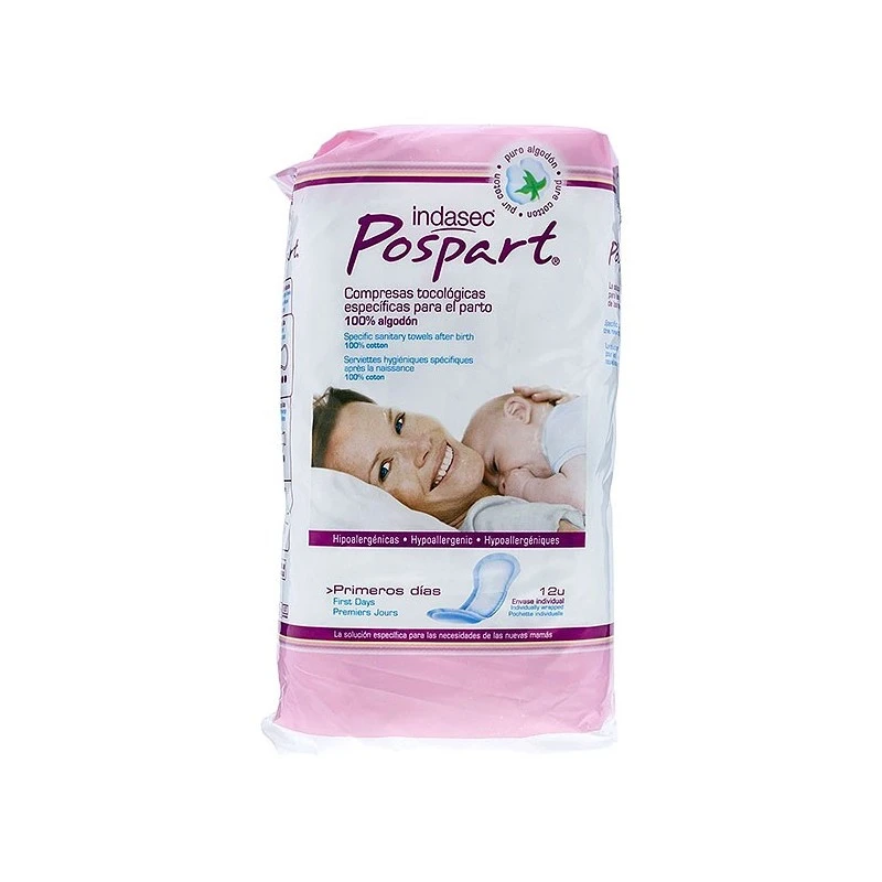 Las Indasec® Pospart® Compresas12 Uds son compresas adecuadas para las pérdidas de líquidos típicas de los días después del parto.