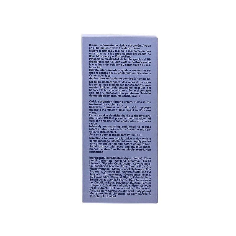 Ayuda a recuperar la elasticidad de la piel. Mejora la firmeza de la piel distendida y facilita la recuperación dérmica gracias a las propiedades del aceite de rosa mosqueta y al proteosilano.