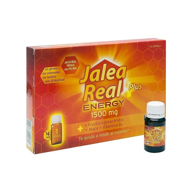 Complemento alimenticio con jalea real fresca, fructooligosacáridos (prebióticos), extracto seco de maca, vitamina C y vitamina B6.