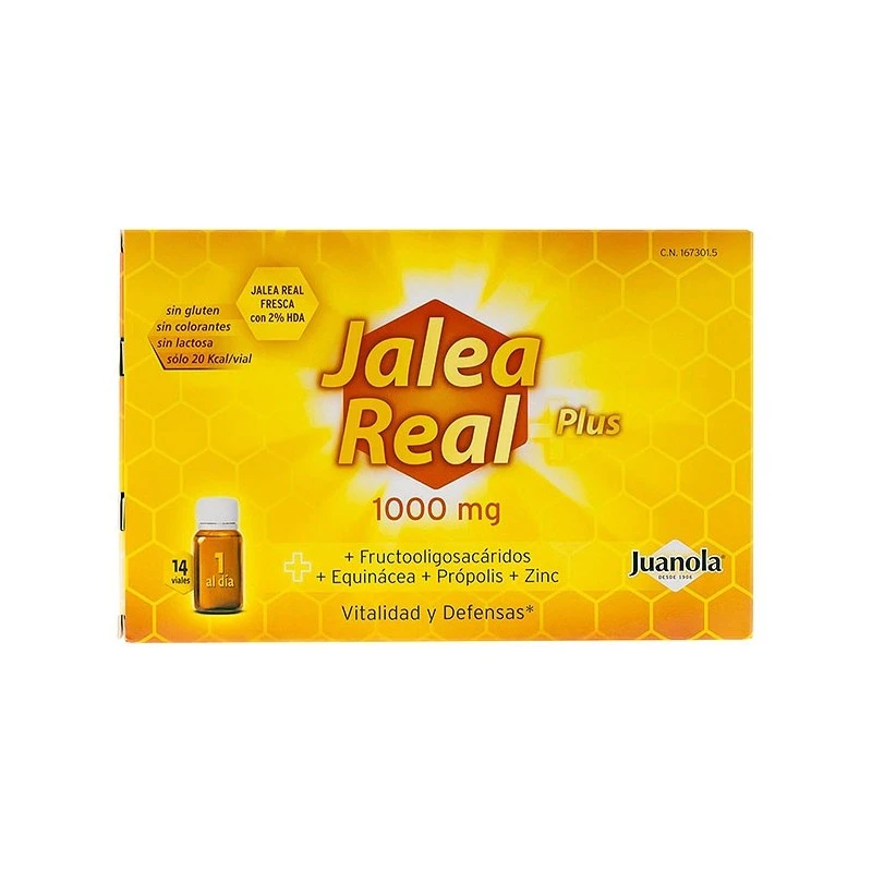 Juanola Jalea Real plus es un complemento alimenticio con jalea real fresca, fructooligosacáridos (prebióticos), equinácea, própolis, vitamina C y Zinc, completamente pensado para ayudar a recuperar la vitalidad.