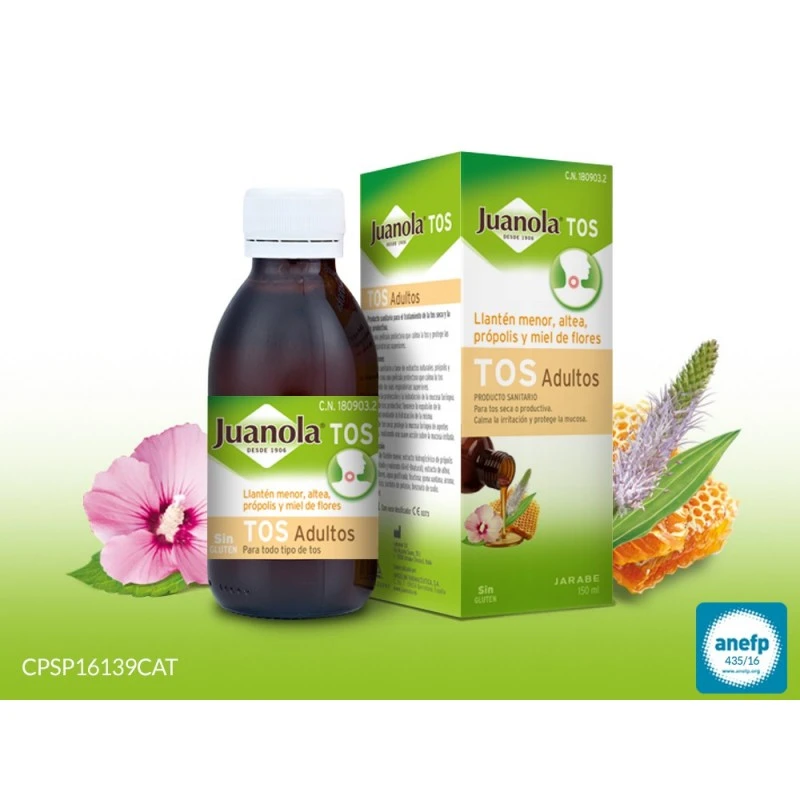 Juanola Jarabe Tos Adultos favorece la expulsión de la mucosidad mediante la hidratación de la misma. En caso de tos seca: protege la mucosa faríngea de agentes irritantes, realizando una suave acción sobre la mucosa irritada.