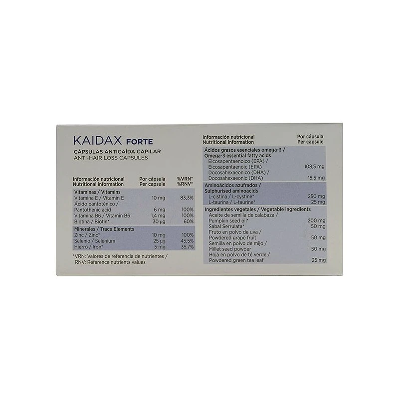 Kaidax Forte 60 Cáps complemento de alimentación en forma de cápsulas especialmente formulado para frenar la caída del cabello ya que aporta todos los nutrientes que necesita nuestro cuero cabelludo ayudando a fortalecer desde la raíz y frenando la caída del pelo. El tratamiento anticaída del cabello en cápsulas de Kaidax es útil en casos de caída ocasional del cabello debida a una deficiencia vitamínica por mala alimentación o por los cambios estacionales que alteran el metabolismo normal del cuerpo.
