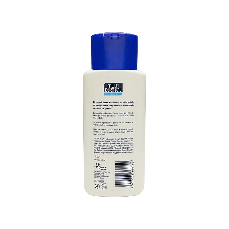 Multidermol champú suave está especialmente diseñado para un óptimo cuidado del cabello evitando la agresión de determinados componentes. Podrá usarlo toda la familia con cualquier tipo de cabello.