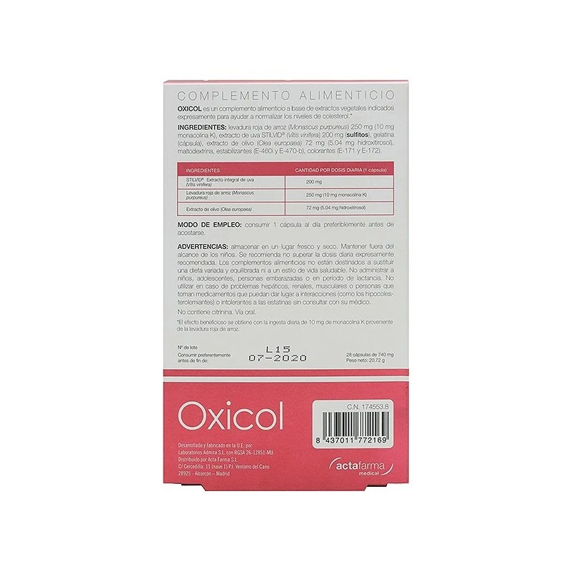 Tenga en cuenta que la respuesta a la toma de estos productos, depende además del metabolismo de cada persona en particular.Oxicol contiene:- MONACOLINA K (10 mg): Gracias a su contenido en Monacolina K ayuda a normalizar los niveles de colesterol.- EXTRACTO DE OLIVO (Hidroxitirosol, 5.04 mg): Rico en hidroxitirosol, que evita la formación de LDL oxidado, uno de los tipos de colesterol que más riesgo entraña.- EXTRACTO DE UVA ENRIQUECIDO (Resveratrol 8 mg): Mejora el perfil de colesterol. Aporta beneficios cardiovasculares.Recomendado para:- Personas con niveles de colesterol elevados.- Personas con intolerancia a tratamientos con hipolipemiantes.- Personas preocupadas por su salud cardiovascular.- Pacientes poli-medicados que necesiten complementar su tratamiento.
