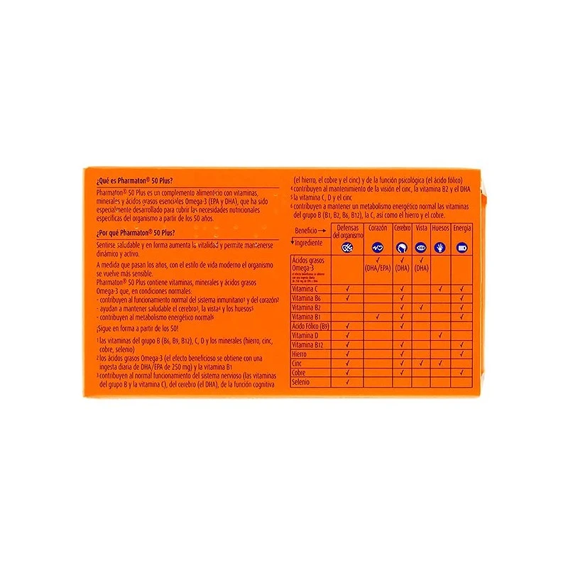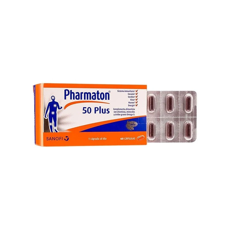 Pharmaton 50 Plus 60 Cápsulas. Pharmaton® 50 Plus contiene una fórmula única de vitaminas, minerales y ácidos grasos Omega-3.