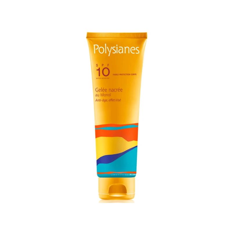Polysianes Gel Nacarado al Monoi SPF10 125ml es un gel protector solar que ofrece a la piel una protección de amplio espectro contra los rayos UVA y UVB para obtener un bronceado prgresivo y duradero.