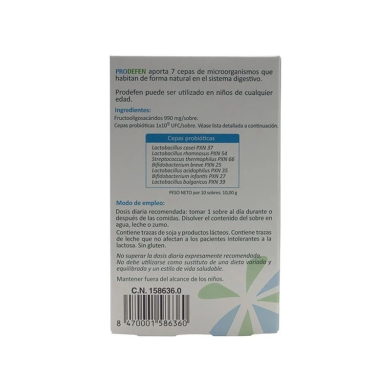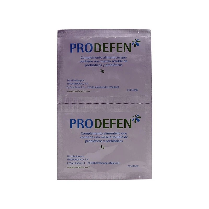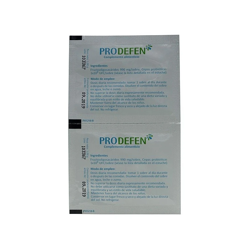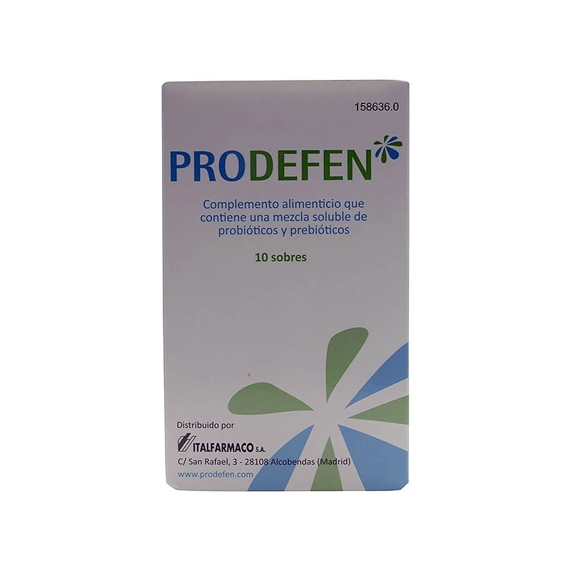 Prodefen 10 Sobres es un complemento alimenticio que contiene una mezcla soluble de 7 cepas beneficiosas (conocidas también como probióticos) y fructooligosacáridos para recuperar la flora intestinal para combatir procesos diarreicos o problemas gastrointestinales reincidentes desde niños hasta adultos.