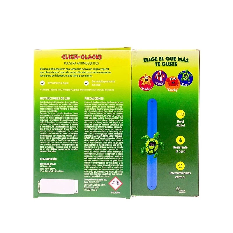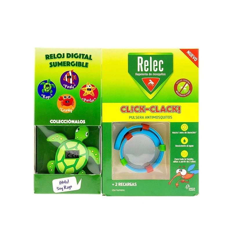 Relec Click-clack pulsera es una divertida y original forma de protegerte de los mosquitos ya que tiene un amplio espectro de actuación. Su sustancia activa es de origen vegetal que dura hasta 1 mes, ideal para actividades al aire libre.-Eficaz contra el mosquito tigre.-Ideal para toda la familia y niños a partir de 3 años.-Contiene 2 recargas.-Resistente al agua.De regalo un reloj digital sumergible en forma de estrella.