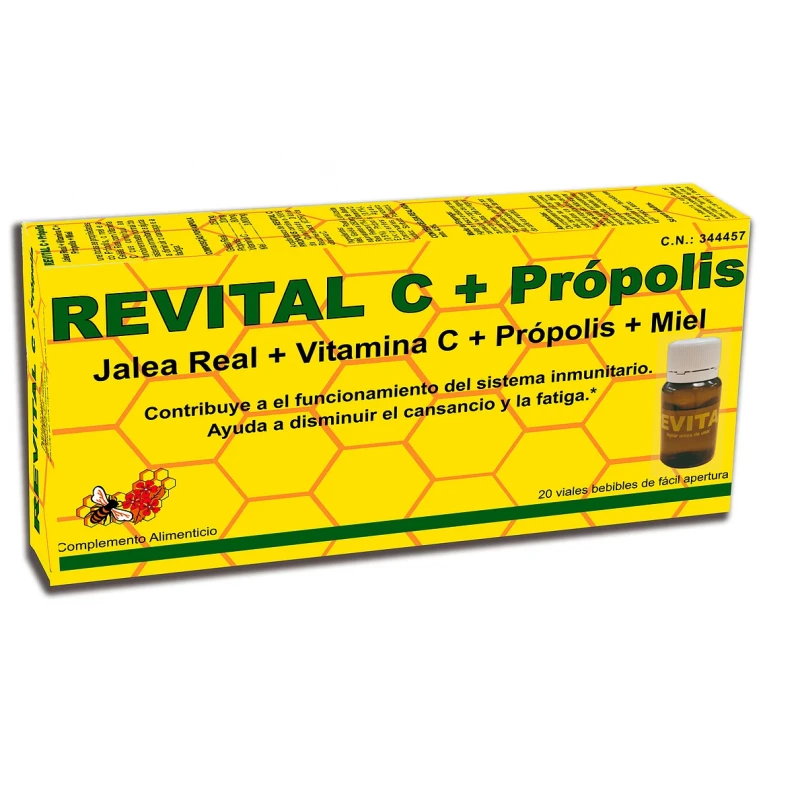 Revital Própolis es un complemento alimenticio a base de Jalea Real, Miel, Própolis y vitamina C que contribuye al funcionamiento del sistema inmunitario y ayuda a disminuir el cansancio y la fatiga.