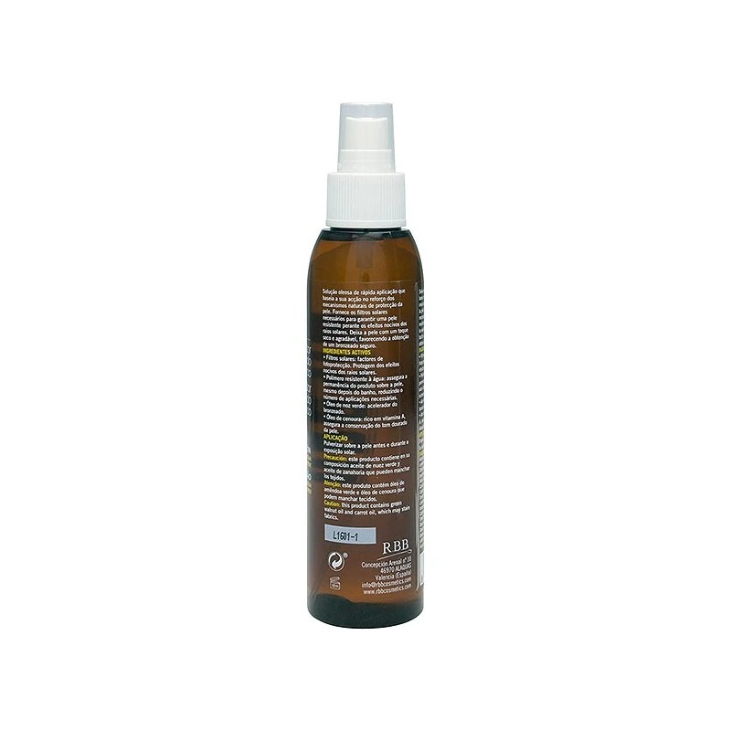 Solución oleosa, ligera y de tacto seco, especialmente formulada para facilitar la adquisición rápida, segura y duradera de un tono bronceado.