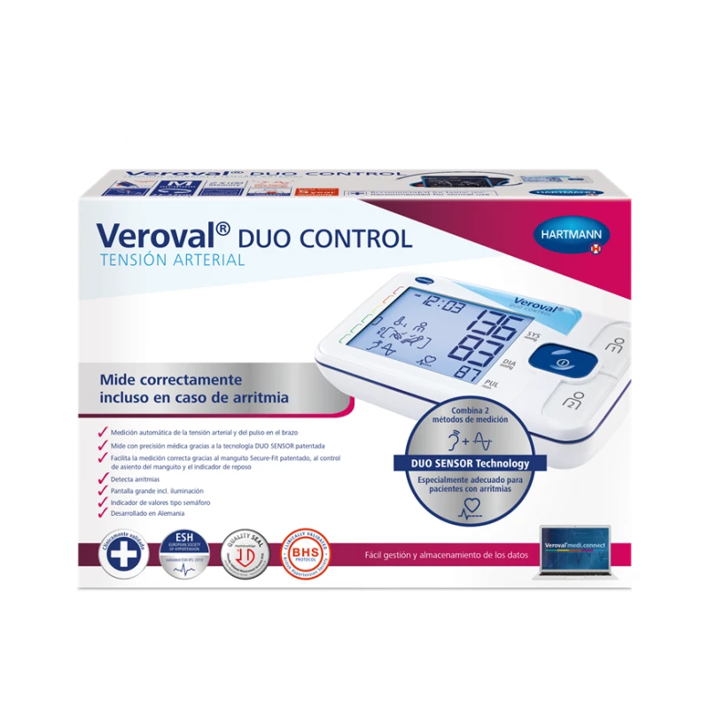 La innovadora Tecnología DUO SENSOR combina dos métodos de medición profesionales: la medición oscilométrica y la medición de Korotkoff. Cuando la mayoría de tensiómetros automáticos del mercado solo funcionan usando la tecnología oscilométrica, que evalúa las ondas del pulso arterial, la Tecnología DUO SENSOR adicionalmente mide usando el método de Korotkoff altamente preciso, donde se usa un micrófono para escuchar los sonidos del corazón. Los Doctores habitualmente usan la medición de Korotkoff para medir la tensión arterial, al ser altamente fiable e inclusoproporciona lecturas correctas en pacientes con arritmias cardíacas