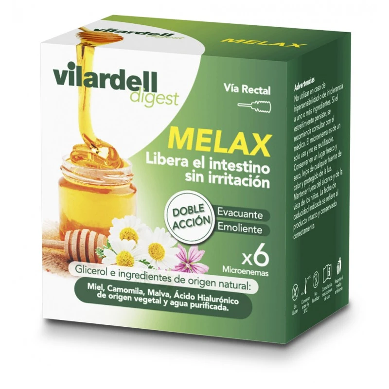 Proporciona una adecuada acción evacuante y al mismo tiempo una acción emoliente. Vilardell Digest Melax se obtiene gracias a una mezcla de agua purificada, glicerol e ingredientes de origen natural (Miel, Camomila, Malva y Ácido Hialurónico de origen vegetal).