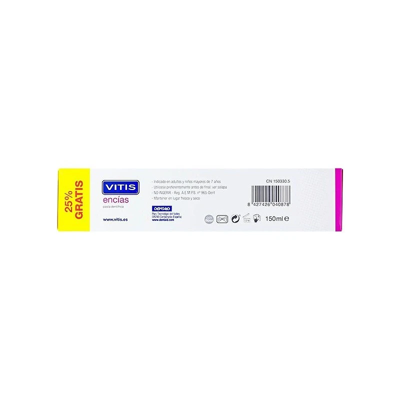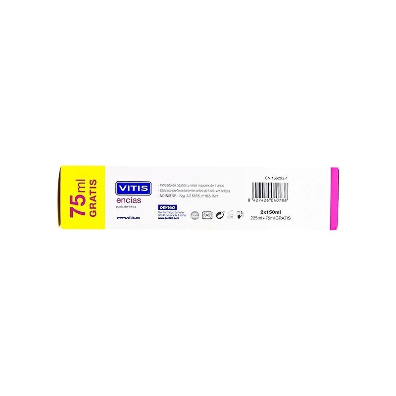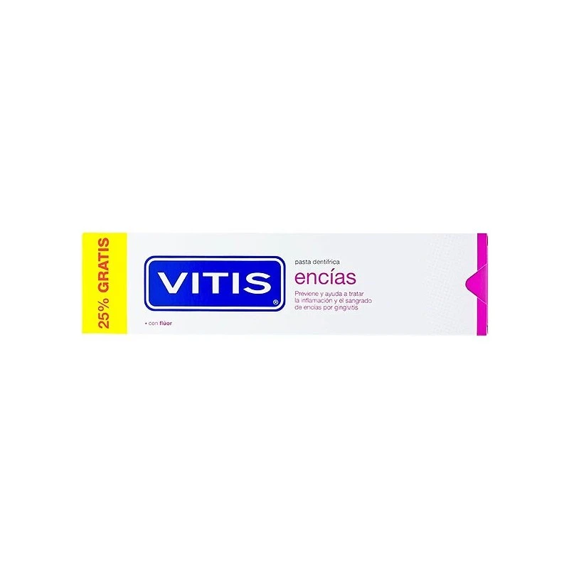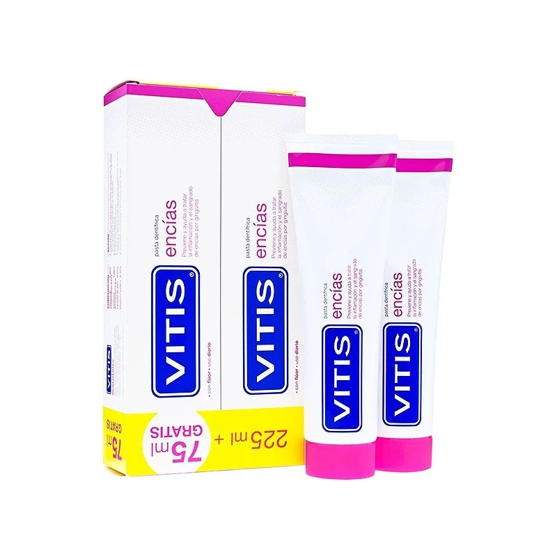 Vitis Encías Pasta Dentífrica 150ml Duplo es uno de los dentífricos más preparados para contrarrestar los efectos derivados del sangrado y de la inflamación gingival. La pasta dental Vitis Encías disminuye el hinchazón al mismo tiempo que mantiene la máxima limpieza de la cavidad bucal.