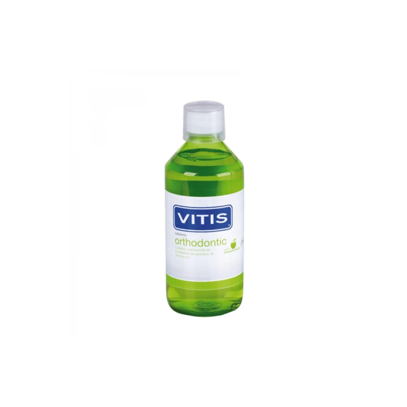 Colutorio Dental Vitis Orthodontic. VITIS orthodontic colutorio esta formulado especialmente para la higiene bucal en portadores de ortodoncia. Proporciona diariamente los principios activos necesarios para mantener una boca sana, con accion antiplaca y remineralizante del esmalte. VITIS orthodontic puede acceder a las zonas dificiles de alcanzar en el cepillado, asegurando asi el cuidado integral de boca, dientes y encias durante el tratamiento ortodontico. Indicaciones: Personas portadoras de aparatos de ortodoncia. Personas propensas a tener aftas bucales, llagas y heridas. Apta para personas celiacas. Envase de 1L.
