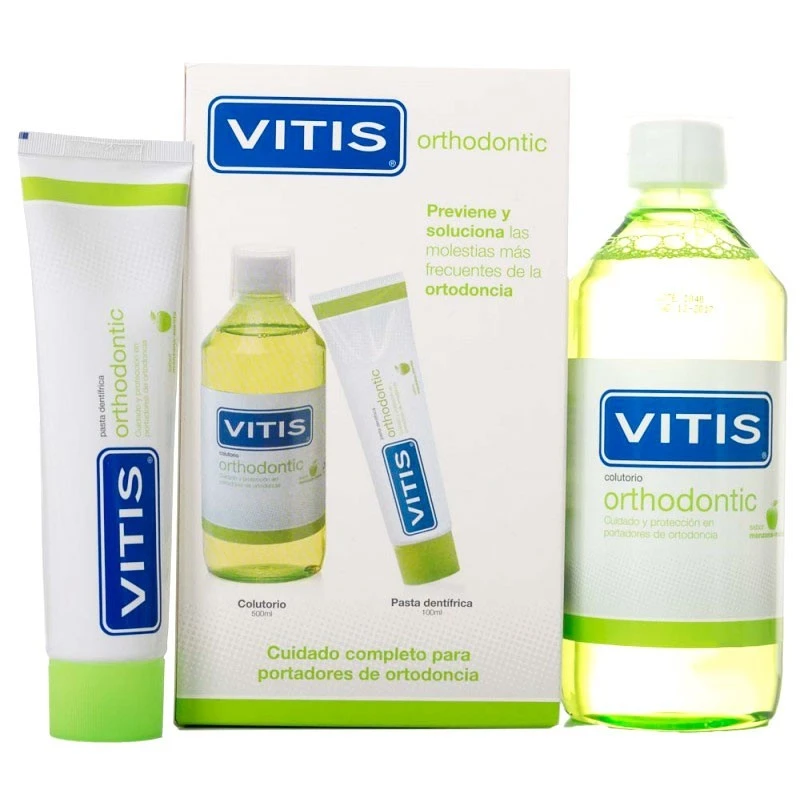 Colutorio Vitis ortodoncia 500 ml del pack colutorio 500 ml y pasta dentífrica 100 ml Vitis ortodoncia con acción antiplaca y remineralizante del esmalte, proporciona diariamente los principios activos necesarios para mantener una boca sana.